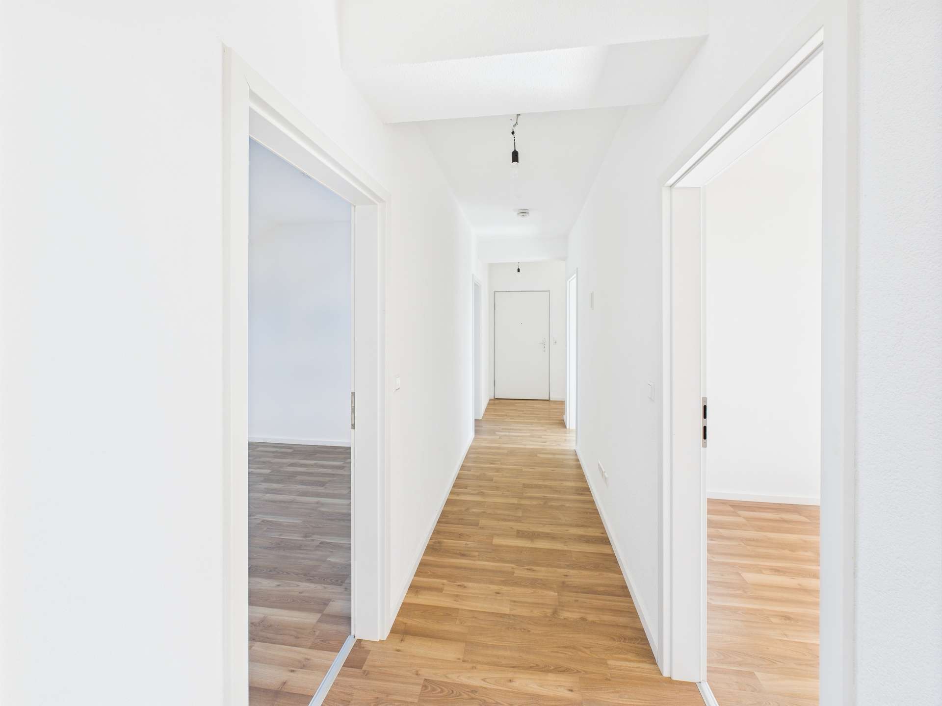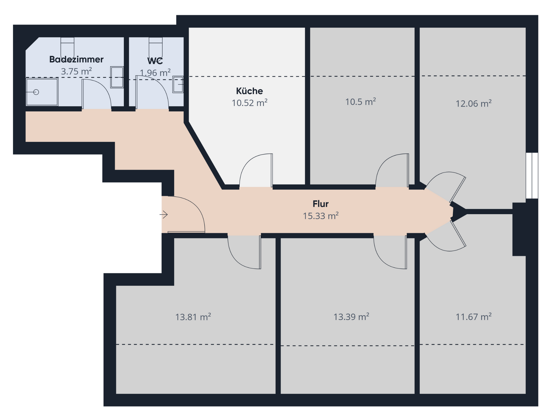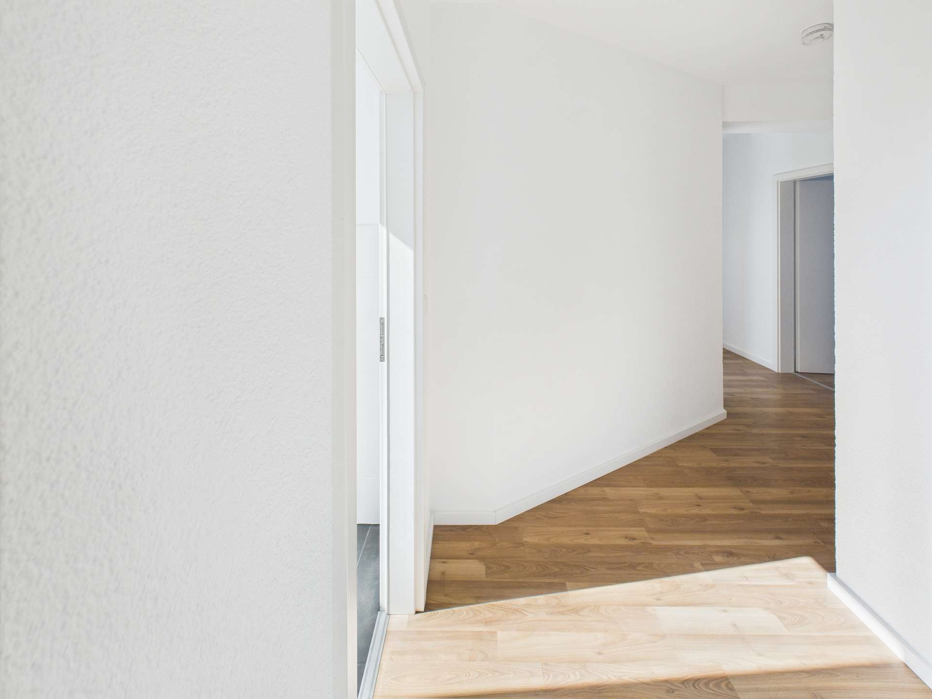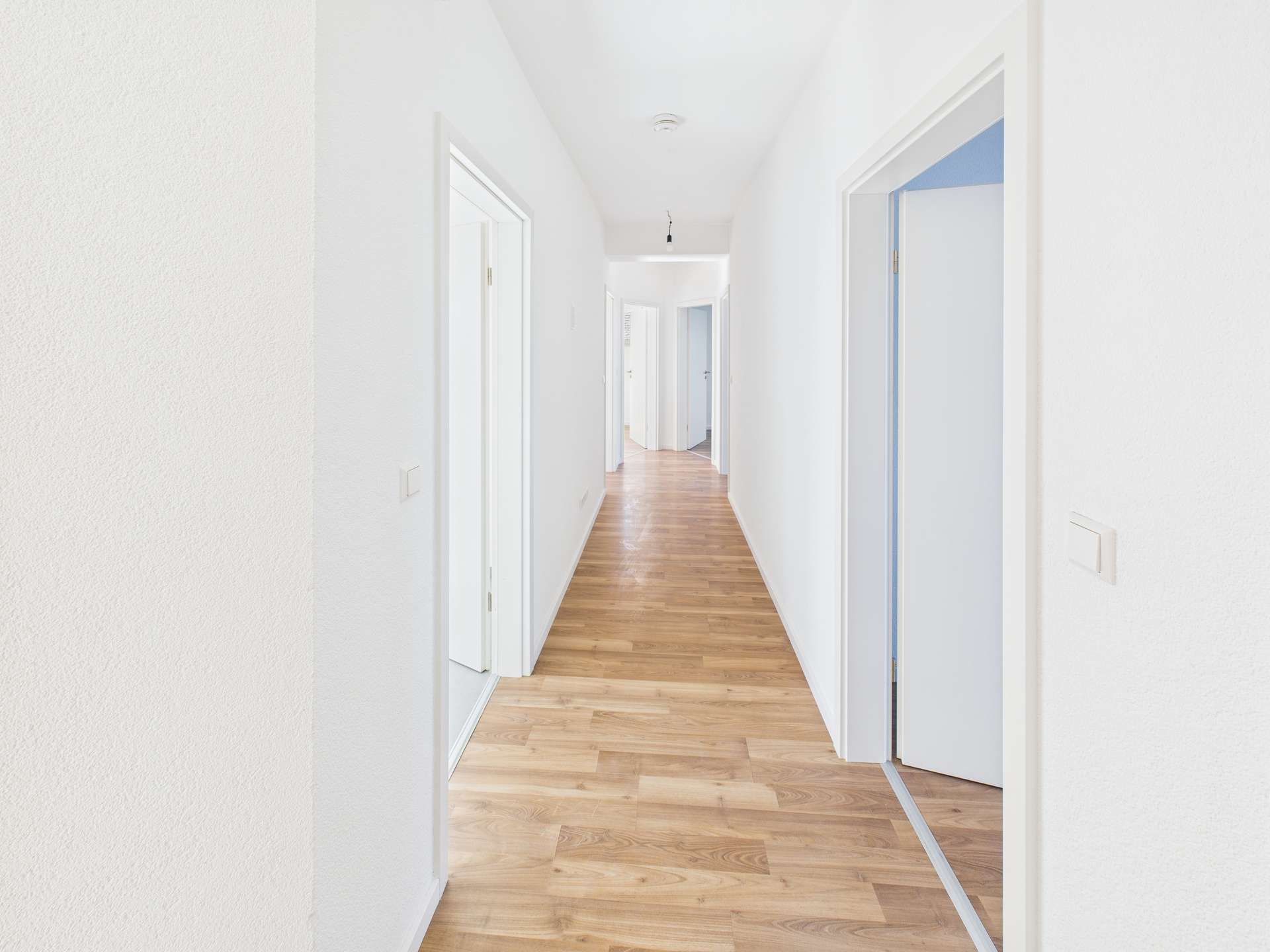 Ein großzügiger Flur sorgt für eine angenehme Erschließung aller Räume und bietet zusätzliche Stellflächen. Die Küche ist großzügig geschnitten und bietet ausreichend Platz für eine moderne Einbauküche mit Essbereich – ein wichtiger Faktor für die Attraktivität bei temporären Mietern. Das modernisierte Badezimmer überzeugt durch eine hochwertige Ausstattung, ergänzt durch ein separates WC, was insbesondere bei mehreren Bewohnern zusätzlichen Komfort bietet.